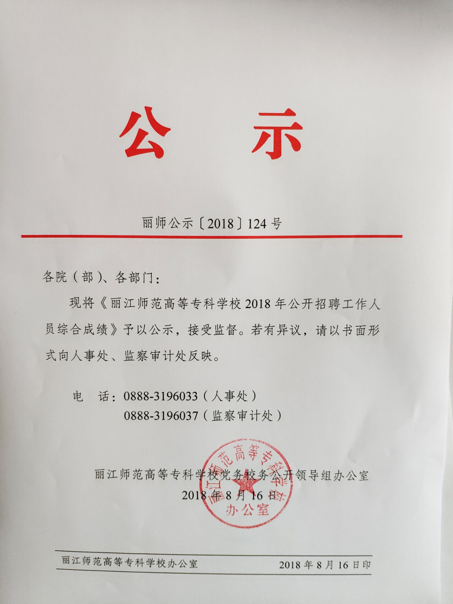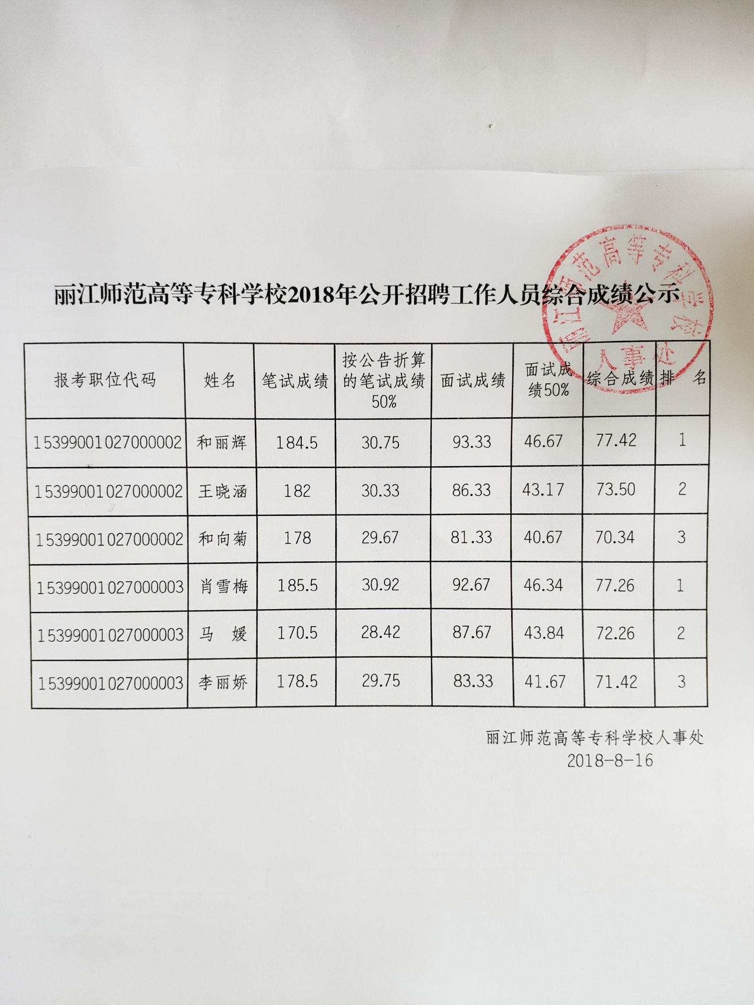 麗江師范高等??茖W(xué)校2018年公開(kāi)招聘工作人員綜合成績(jī)公示