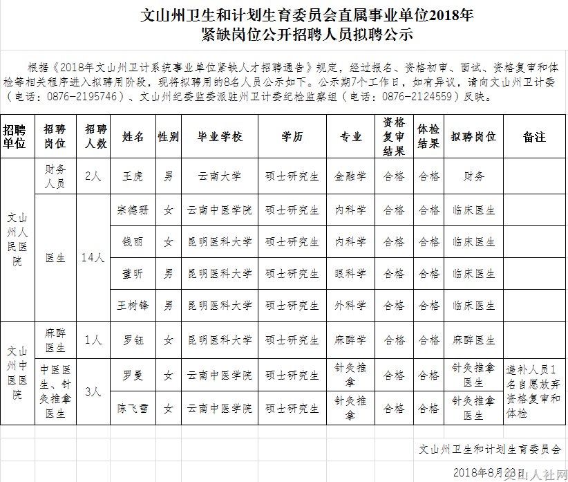 文山州衛(wèi)計委直屬事業(yè)單位2018年緊缺崗位公開招聘人員擬聘公示