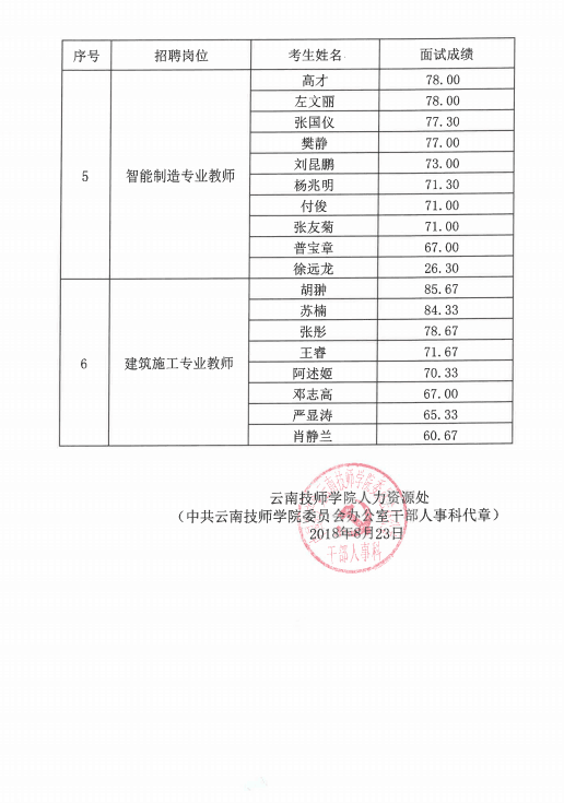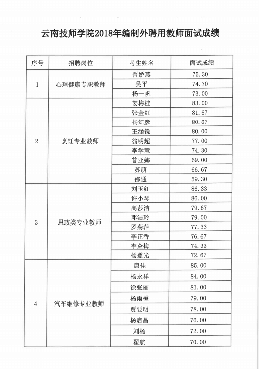 云南技師學(xué)院2018年編制外聘用教師面試成績(jī)