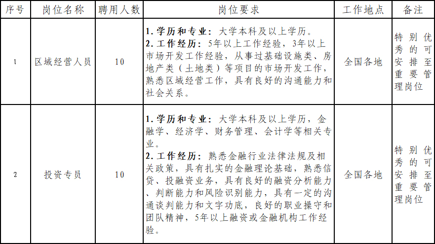 根據(jù)企業(yè)生產(chǎn)經(jīng)營(yíng)發(fā)展需要,現(xiàn)面向中國(guó)鐵建系統(tǒng)內(nèi)和社會(huì)公開(kāi)招聘區(qū)域經(jīng)營(yíng)、投資專(zhuān)員等崗位專(zhuān)業(yè)人才,具體招聘崗位、招聘條件及應(yīng)聘方式公告如下: