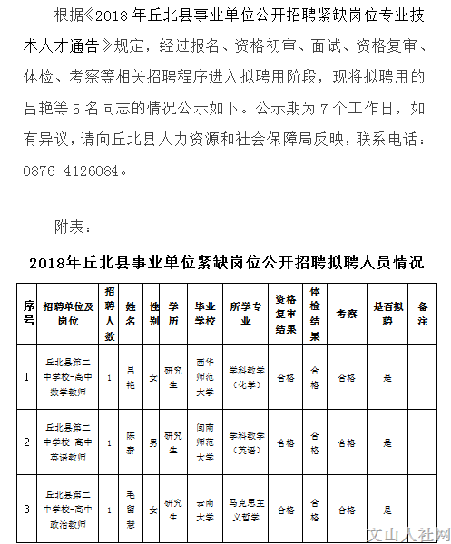 2018年丘北縣事業(yè)單位緊缺崗位公開招聘崗位擬聘人選公示