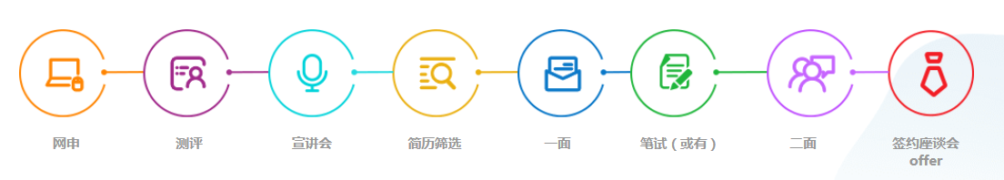 A:網(wǎng)申-測(cè)評(píng)-宣講會(huì)-簡(jiǎn)歷篩選-一面-筆試(或有)-二面-簽約座談會(huì)/Offer。