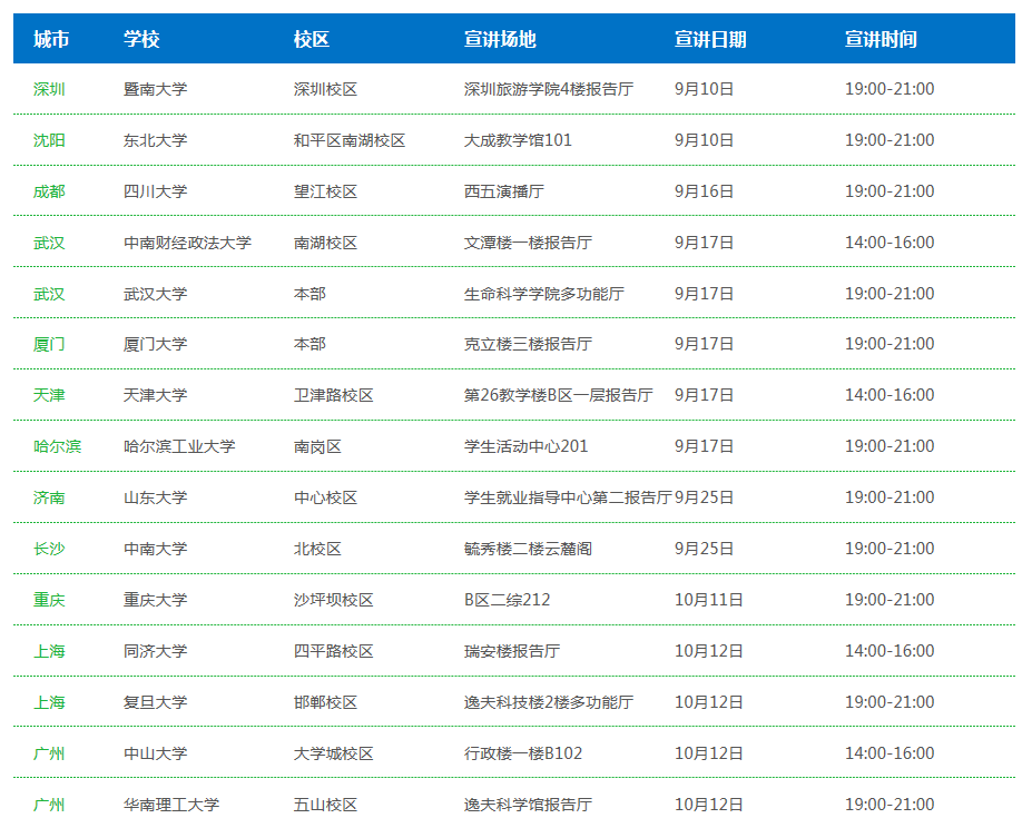 A:對(duì)于沒(méi)有安排校園宣講會(huì)的城市,華僑城集團(tuán)同樣期待大家的簡(jiǎn)歷,我們會(huì)安排這部分通過(guò)簡(jiǎn)歷篩選的同學(xué)在就近的宣講會(huì)城市進(jìn)行面試。