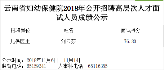 云南省婦幼保健院2018年公開招聘高層次人才面試人員成績公示
