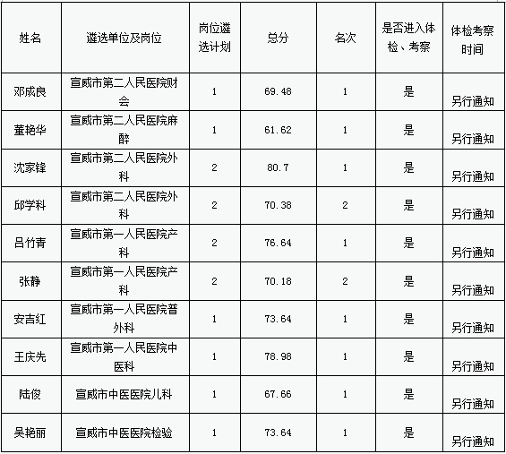 擬進(jìn)入體檢、考察人員名單