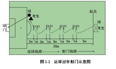 (一)考試方法:如圖 2-2 所示,從罰球區(qū)線中點垂直向場內(nèi)延伸 至 20 米處,畫一條平行于球門線的橫線作為起點線。距罰球區(qū)線 2 米處起,沿 20 米垂線共插置 8 根標志桿。考生將球置于起點線上, 運球依次繞過 8 根標志桿后起腳射門,球動開表計時,當球從空中 或地面越過球門線時停表,記錄完成的時間。凡出現(xiàn)漏桿、射門偏 出球門,球擊中橫梁或立柱彈出,均屬無效,不計成績。每人測試 2 次,取最好成績。
