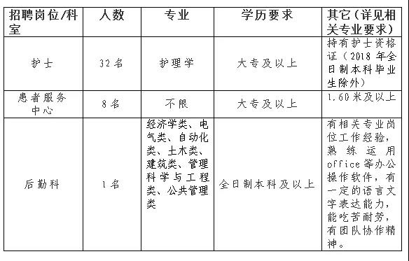 1)學(xué)歷要求:大專及以上學(xué)歷(本科生、有縣級(jí)醫(yī)院工作經(jīng)驗(yàn)者優(yōu)先);2)年齡要求:30周歲及以下(1989年1月后出生,持有主管護(hù)師職稱的可放寬至35周歲);
