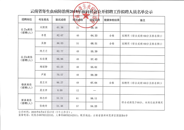 云南省寄生蟲病防治所2019年擬聘人員公示