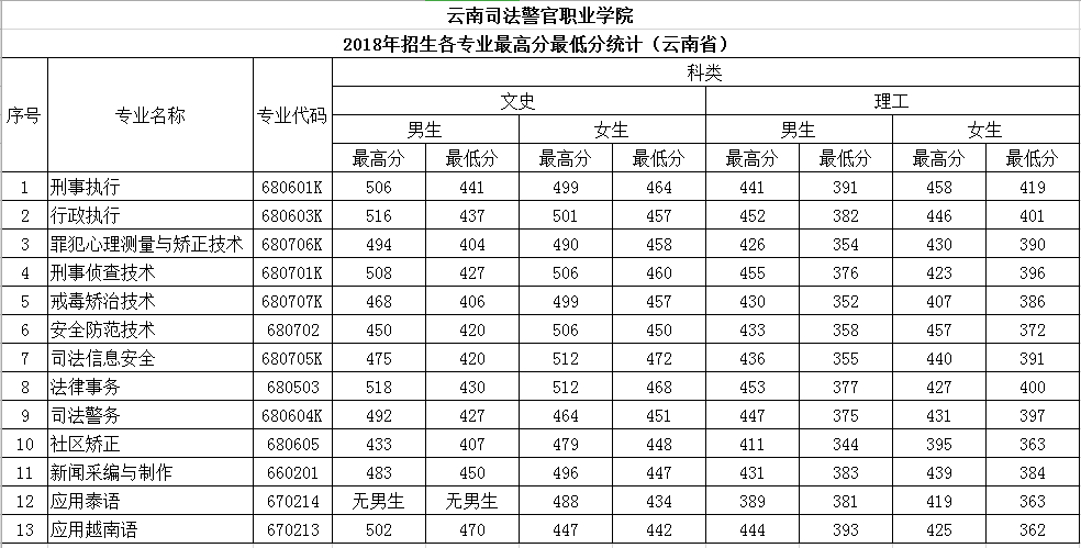 云南司法警官職業(yè)學(xué)院2018年招生各專業(yè)最高分最低分統(tǒng)計(jì)(云南省)
