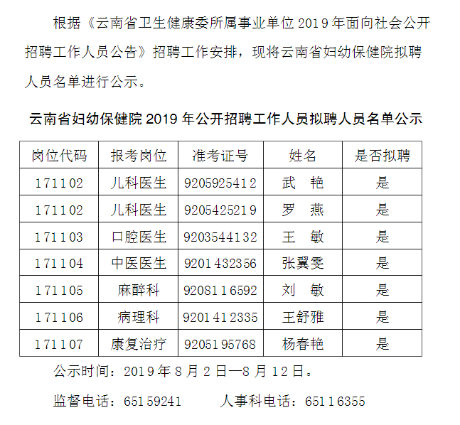 云南省婦幼保健院2019年面向社會公開招聘事業(yè)編制工作人員擬聘人員名單公示