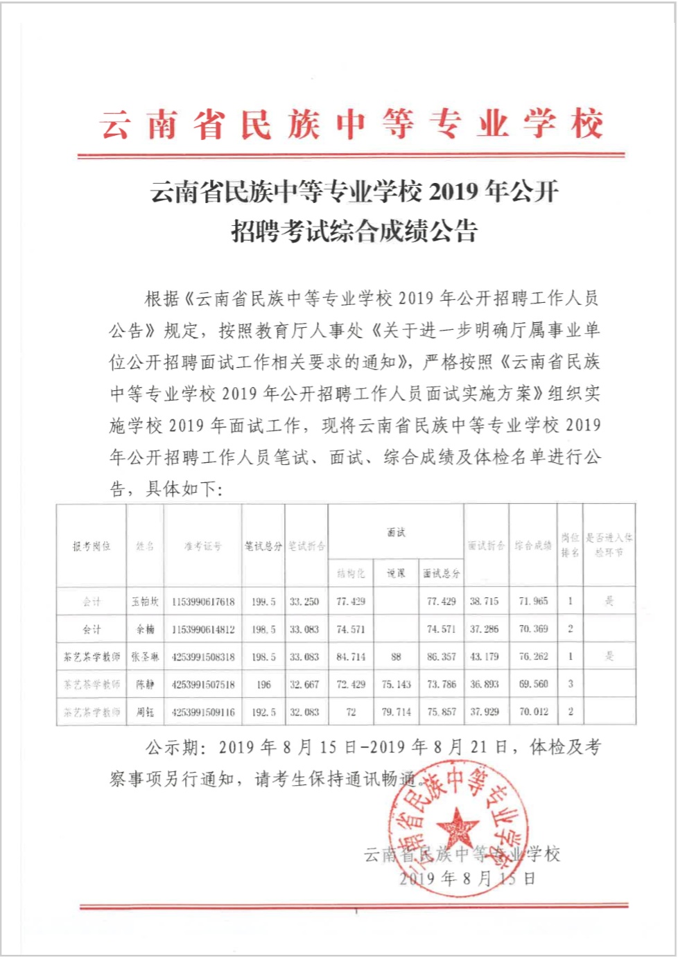 云南省民族中等專業(yè)學(xué)校2019年招聘考試綜合成績公告