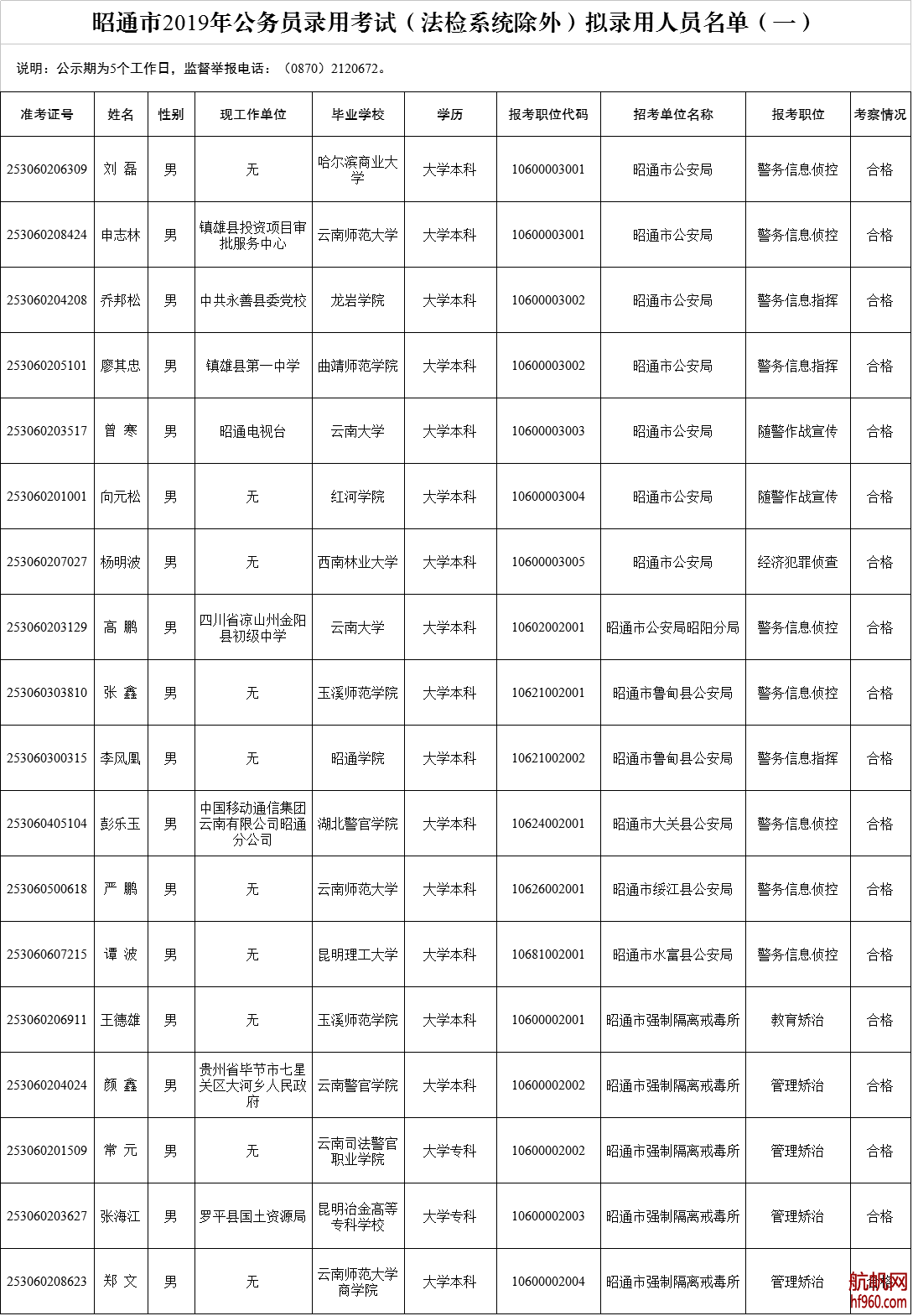 昭通市2019年公務(wù)員錄用考試(法檢系統(tǒng)除外)擬錄用人員名單(一)