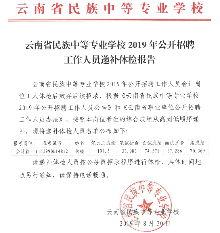 云南省民族中等專業(yè)學校2019年公開招聘工作人員遞補體檢公告
