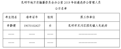 根據(jù)《昆明市2019年市級機(jī)關(guān)公開遴選公務(wù)員(參公管理人員)公告》有關(guān)規(guī)定,經(jīng)筆試、面試、考察和體檢等程序,昆明市地方志編纂委員會辦公室擬遴選李靜婕1名同志,現(xiàn)進(jìn)行公示。人選情況見附件。