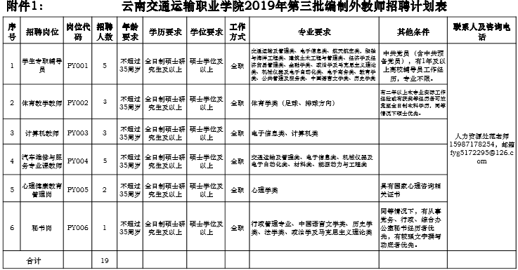 招聘崗位、專業(yè)及相關(guān)要求詳見(jiàn)《云南交通運(yùn)輸職業(yè)學(xué)院2019年編制外教師招聘計(jì)劃表》(附件1)。報(bào)名時(shí)間:2019年9月20日至10月6日。