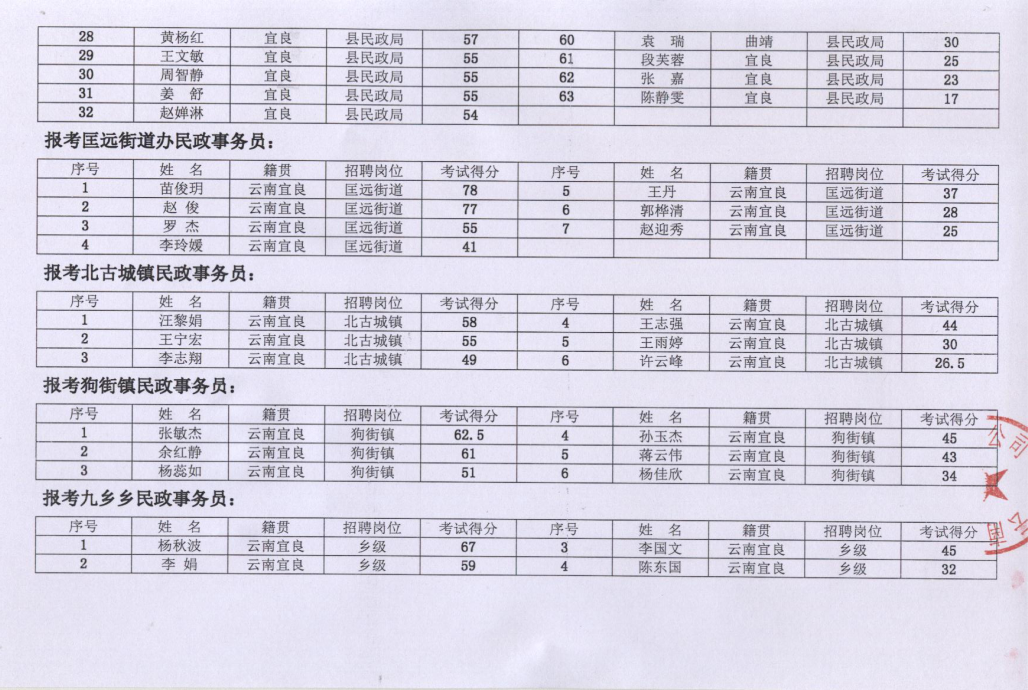 宜良縣政府購買服務(wù)招聘民政事務(wù)員筆試成績公示表