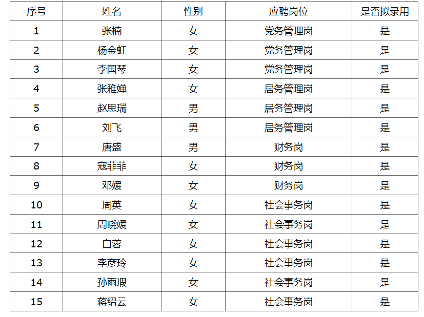 根據(jù)《阿拉街道辦事處2019年公開招聘社區(qū)專職工作人員公告》要求,此次招聘筆試、面試、體檢工作已結(jié)束?,F(xiàn)將擬錄用崗位及人員名單公示如下: