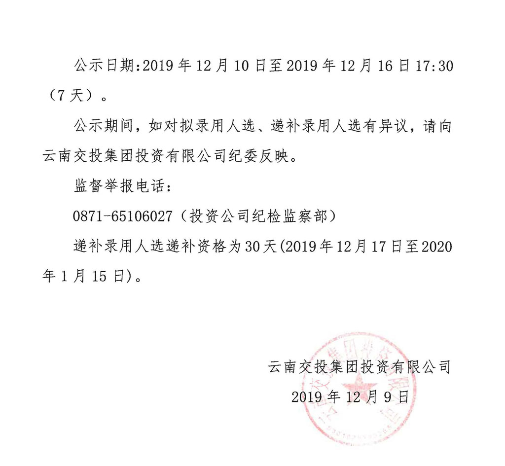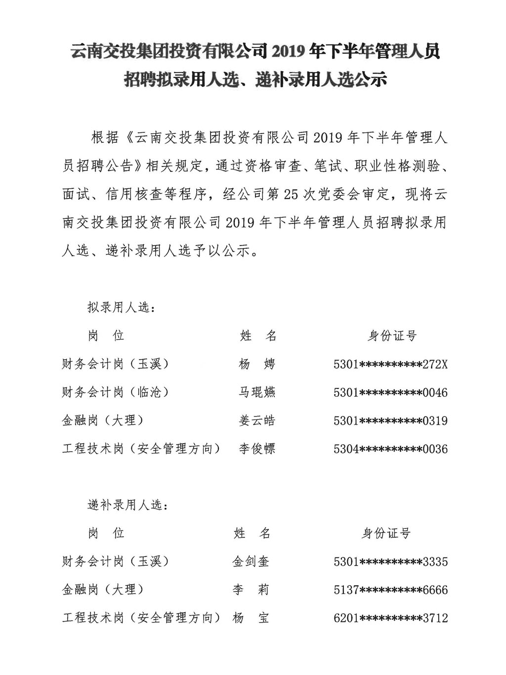 云南交投集團(tuán)投資有限公司2019年下半年管理人員招聘擬錄用人選、 遞補(bǔ)錄用人選公示