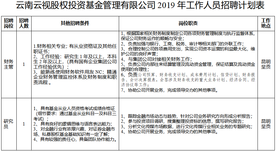 詳見《云南云視股權(quán)投資基金管理有限公司2019年工作人員招聘計劃表》。