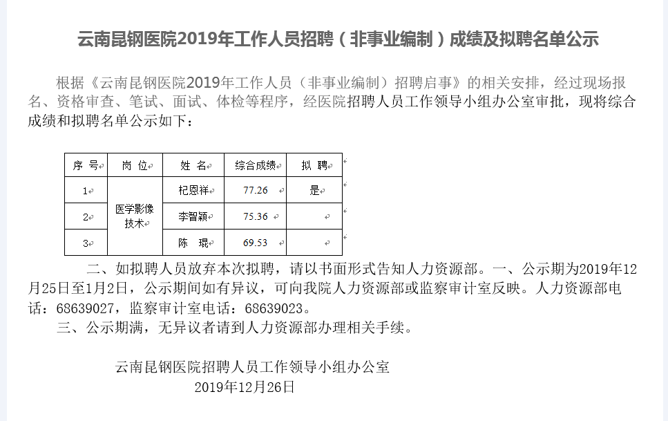 云南昆鋼醫(yī)院2019年工作人員招聘(非事業(yè)編制)成績(jī)及擬聘名單公示