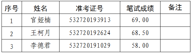 根據(jù)《普洱市衛(wèi)生健康委員會2019年公開遴選參照公務(wù)員法管理單位工作人員公告》(第1號),普洱市委組織部和市人社局于2019年12月7日統(tǒng)一組織開展了“衛(wèi)生健康監(jiān)督執(zhí)法崗職位(職位代碼B005001)”公開遴選的筆試工作?,F(xiàn)將有關(guān)事項公告如下: