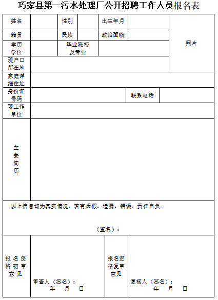 附:巧家縣第一污水處理廠公開招聘工作人員報名表