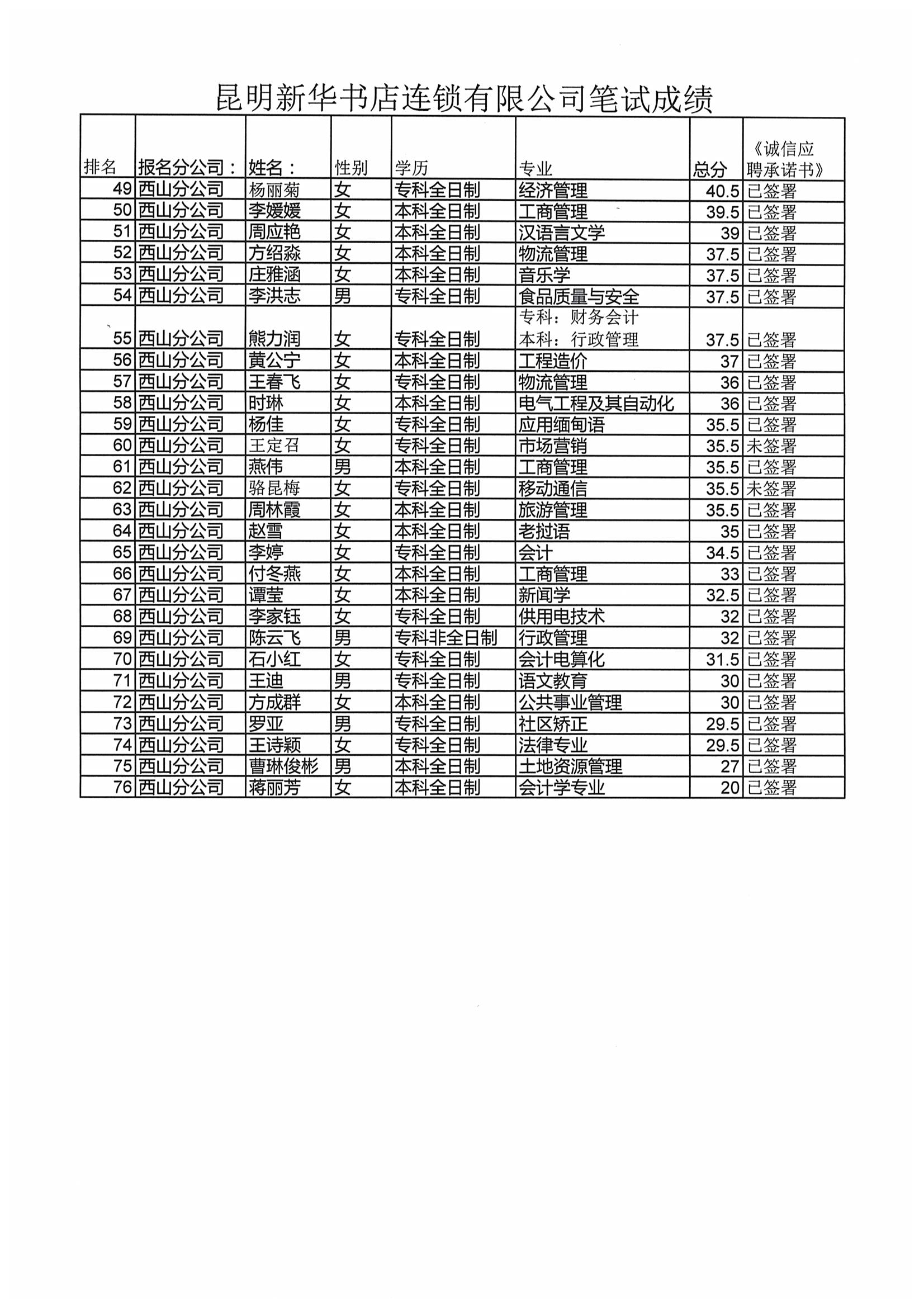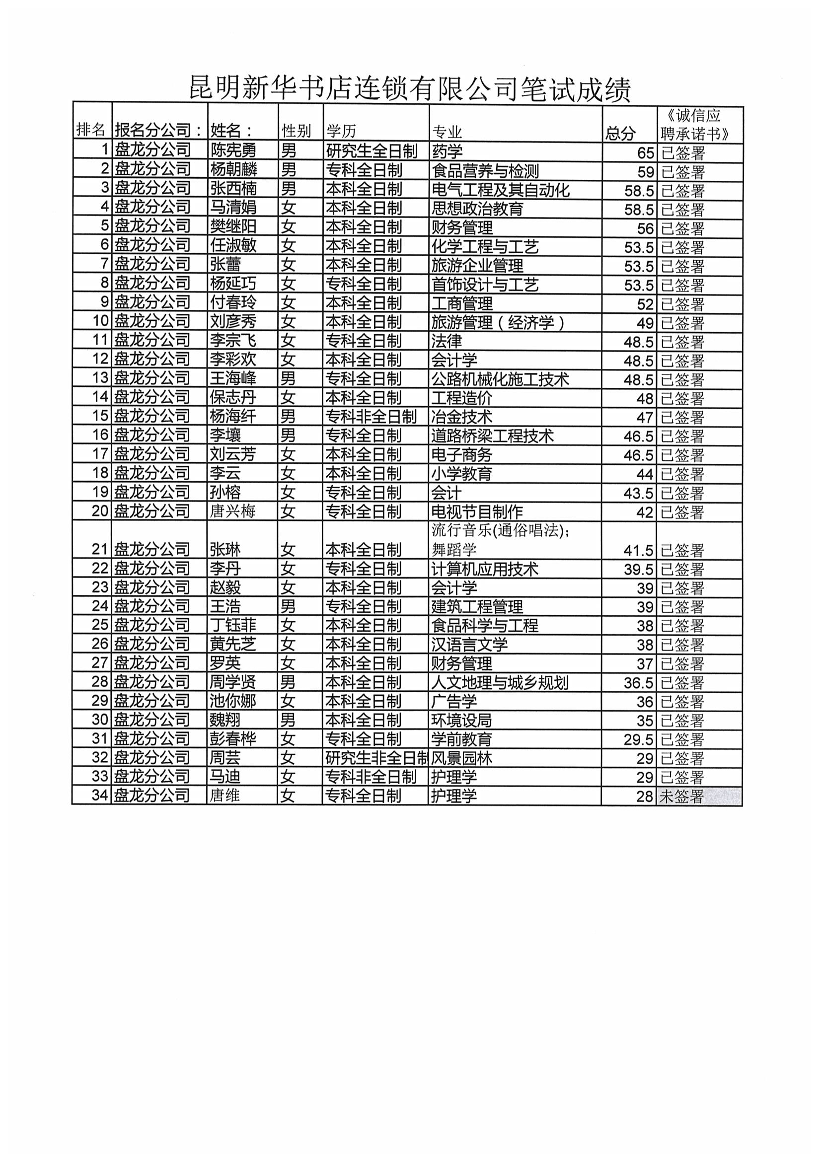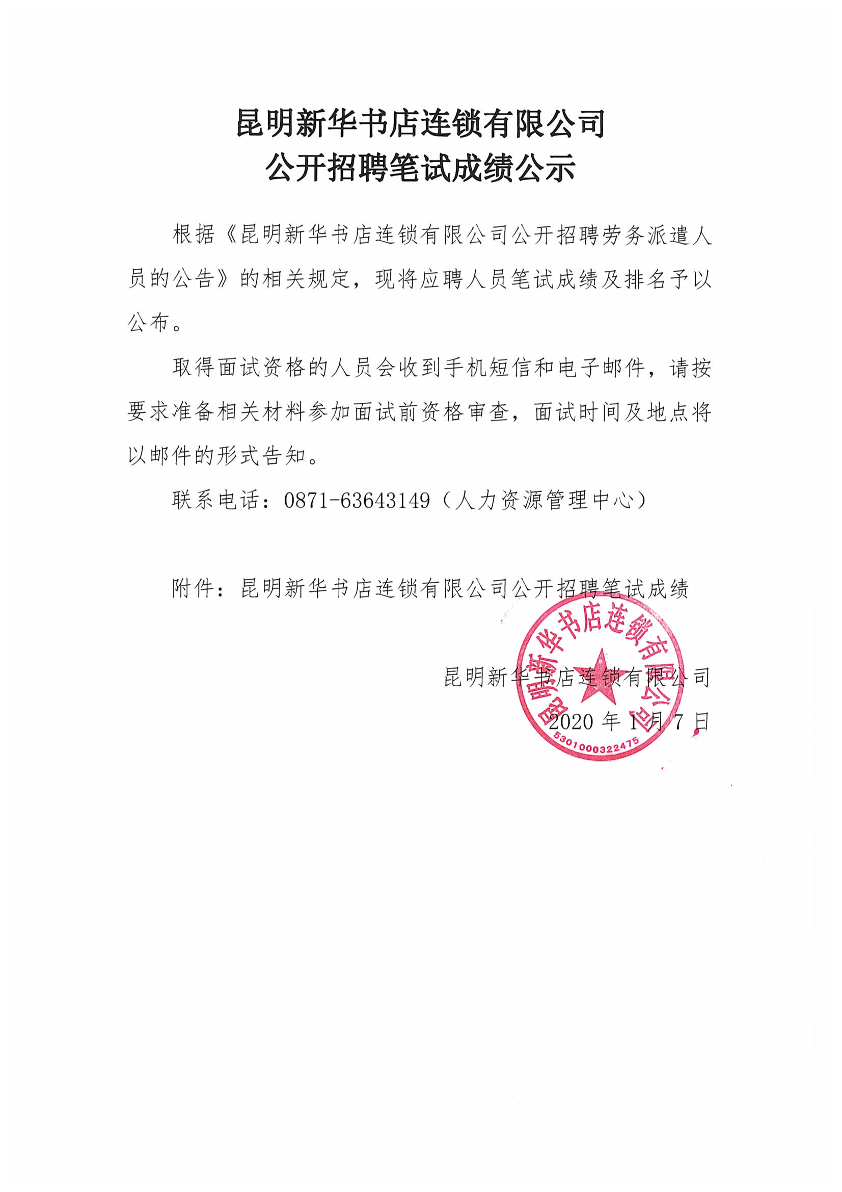 昆明新華書店連鎖有限公司公開招聘筆試成績公示