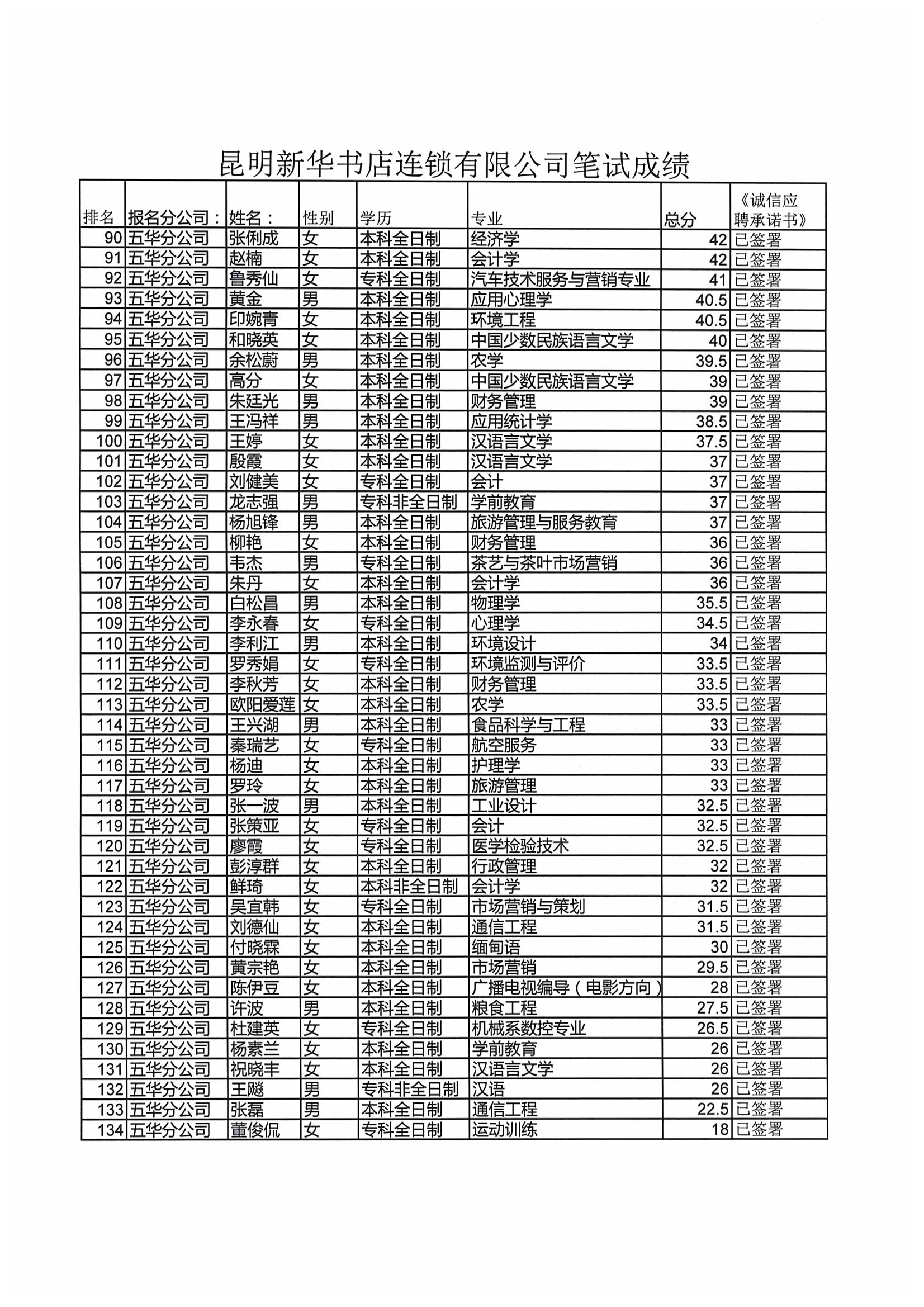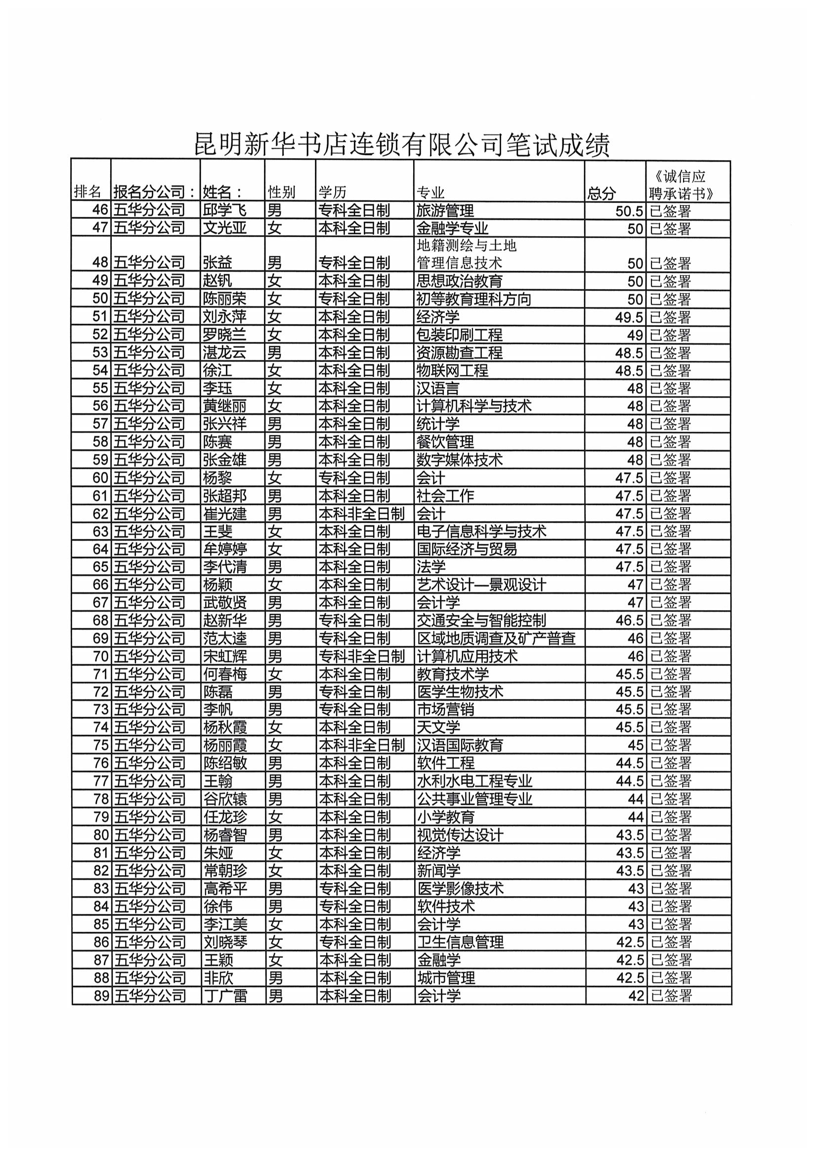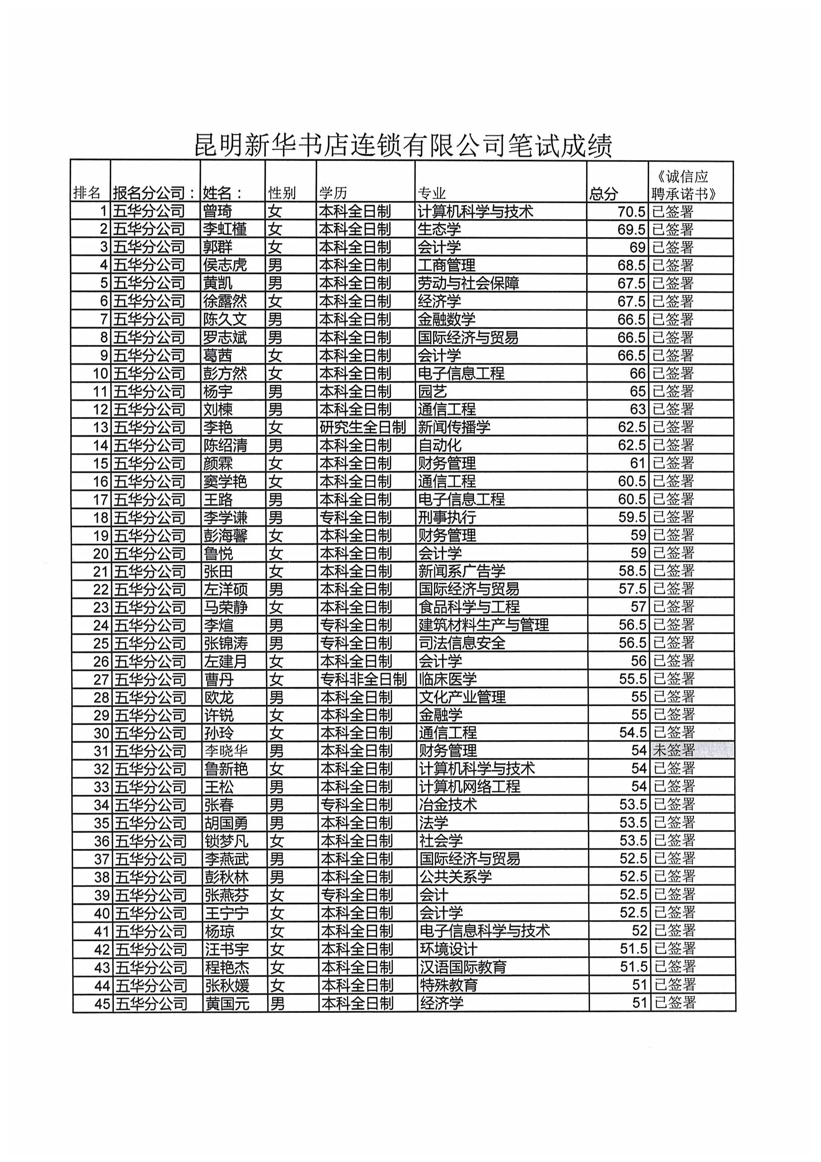 昆明新華書店連鎖有限公司公開招聘筆試成績公示