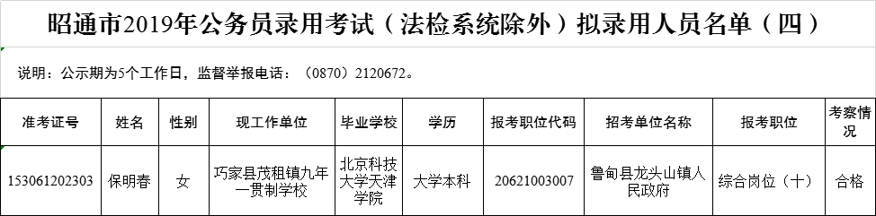 昭通市2019年公務(wù)員錄用考試(法檢系統(tǒng)除外)擬錄用人員名單(四)