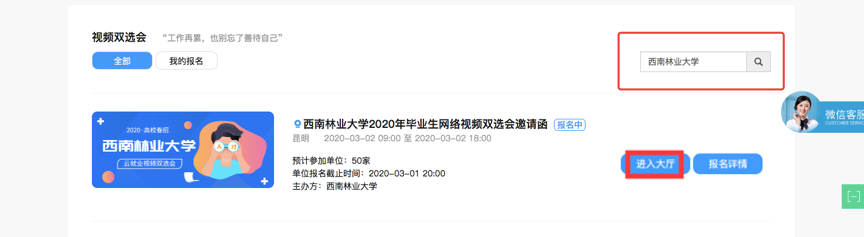 進(jìn)入小程序后,點擊“雙選會”選擇“云就業(yè)視頻雙選會”搜索-西南林業(yè)大學(xué)2020年畢業(yè)生網(wǎng)絡(luò)視頻雙選會,進(jìn)入后可點擊“報名進(jìn)入會場”進(jìn)行報名,提前了解單位和各崗位信息。