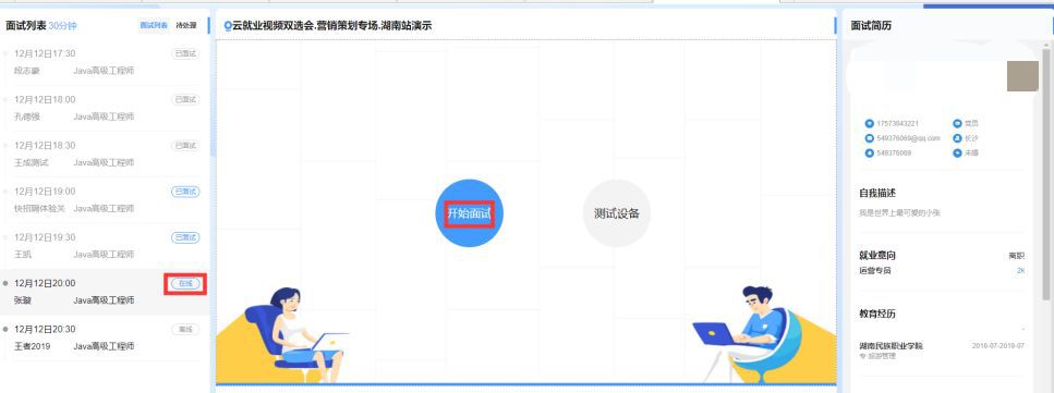 報名后可提前查看各參會企業(yè)信息,進(jìn)行簡歷投遞和面試申請,并留意相關(guān)通知,在視頻雙選會當(dāng)天即可在線上和企業(yè)hr進(jìn)行線上互動及視頻,亦可主動發(fā)起面試。