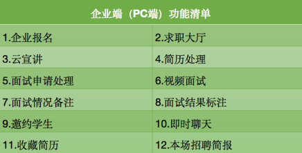 用人單位可在線發(fā)職位,收發(fā)簡歷,人才在線邀請對接,分專業(yè)、學(xué)院、意愿進(jìn)行分類篩選人才,即時交流,群發(fā)通知及視頻面試等。