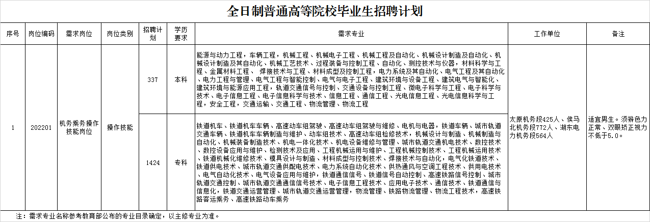 (三)??茖W(xué)歷畢業(yè)生。列入國(guó)家招生計(jì)劃,于畢業(yè)學(xué)年7月31日前取得畢業(yè)證。就讀院校須開(kāi)設(shè)有鐵路特色專業(yè),所學(xué)專業(yè)為鐵路方向,所學(xué)課程為鐵路主專業(yè)課程。具備派遣資格的全日制普通高等院校應(yīng)屆畢業(yè)生。