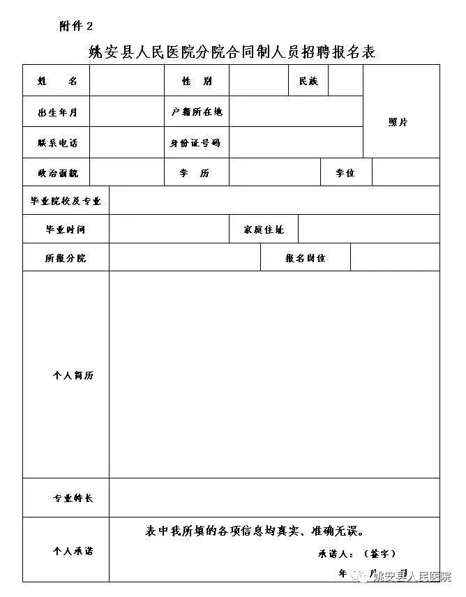 2、《姚安縣人民醫(yī)院分院合同制人員招聘報(bào)名表》