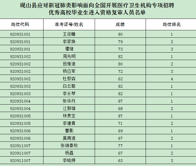 附件:硯山縣應(yīng)對(duì)新冠肺炎影響面向全國(guó)開展醫(yī)療衛(wèi)生機(jī)構(gòu)專項(xiàng)招聘優(yōu)秀高校畢業(yè)生進(jìn)入資格復(fù)審人員名單