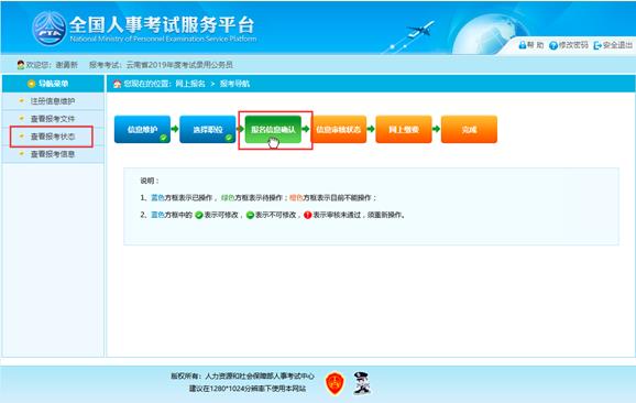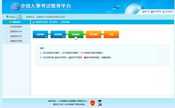 通過(guò)點(diǎn)擊“確認(rèn)”按鈕,提示確認(rèn)成功后跳轉(zhuǎn)到報(bào)考流程頁(yè)面,則完成填報(bào)信息操作。如下圖所示: