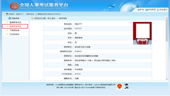 考生可以通過(guò)點(diǎn)擊“查看報(bào)考信息”按鈕,查看考生填寫的報(bào)考信息,如下圖所示: