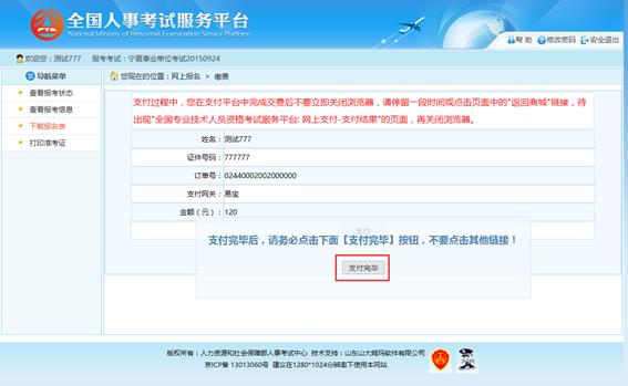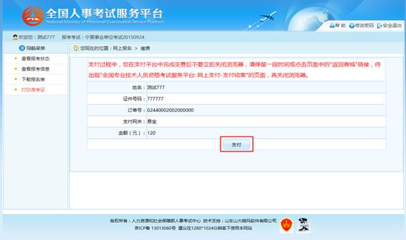 選擇完成后點(diǎn)擊“生成訂單”按鈕,可以生成訂單,訂單確認(rèn)無(wú)誤后,點(diǎn)擊“支付”按鈕,成功后再點(diǎn)擊“支付完畢”按鈕完成網(wǎng)上支付操作,如下圖所示: