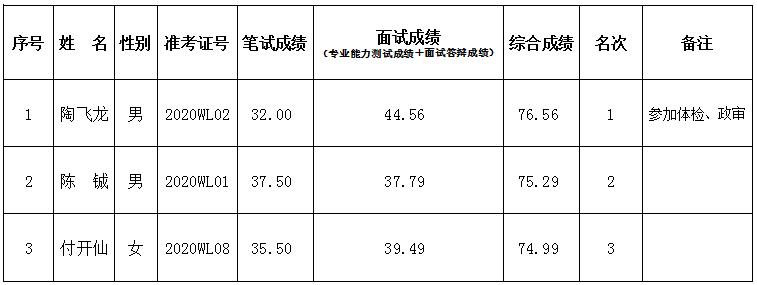 綜合成績總分為100,其中筆試成績占50%、面試答辯成績占10%、專業(yè)能力測試成績占40%(綜合成績=筆試成績×50%+面試答辯成績×10%+專業(yè)能力測試×40%)。所有成績按四舍五入保留兩位小數(shù)進行計算。如出現(xiàn)綜合成績相同情況,以筆試成績較高者優(yōu)先。綜合成績第一名參加體檢、政審。