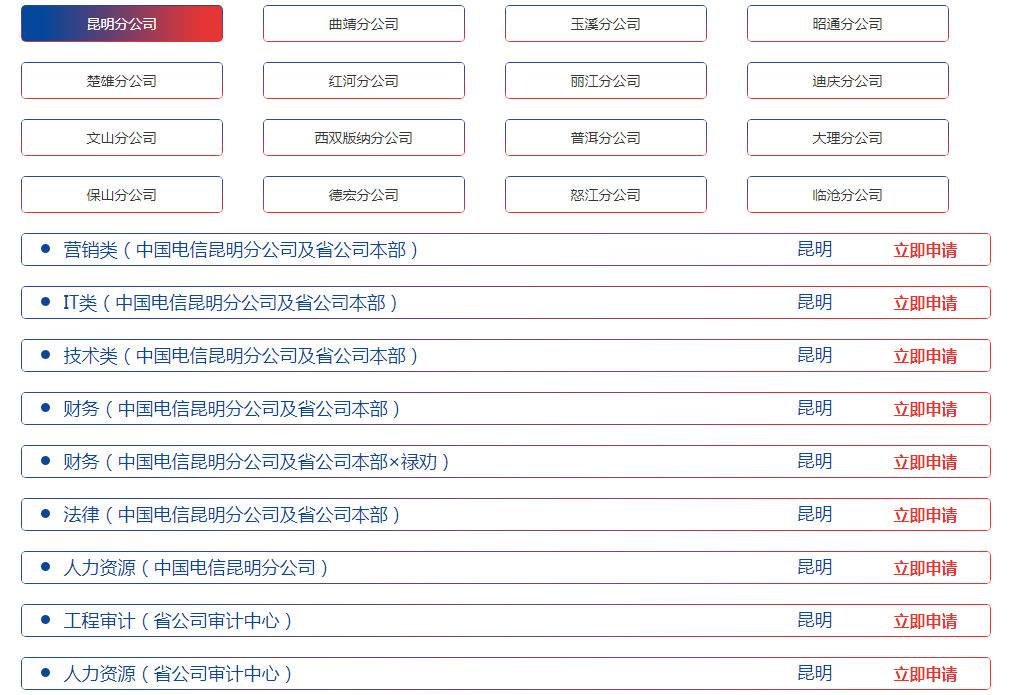請登錄中國電信集團有限公司網(wǎng)站——“招賢納士”專欄(http://www.chinatelecom.com.cn/zp/)查看招聘信息,并進行網(wǎng)上申請。各分子公司的具體崗位報名截止日期略有不同,具體情況詳見各分子公司公告。