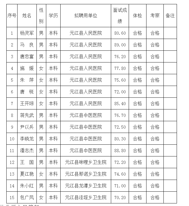 根據(jù)《云南省事業(yè)單位公開招聘工作人員辦法》、《玉溪市關(guān)于進(jìn)一步規(guī)范玉溪市事業(yè)單位提前招聘工作人員的通知》(玉人社發(fā)〔2019〕91號(hào))、《元江縣人民醫(yī)院2020年提前招聘工作人員公告》和《元江縣事業(yè)單位2020年提前招聘工作人員公告》,經(jīng)發(fā)布公告、報(bào)名、資格審查、考核、確定聘用人選、簽訂就業(yè)協(xié)議、報(bào)到及資格復(fù)審,并體檢、考察合格,確定擬聘用人員15人,現(xiàn)公示如下: