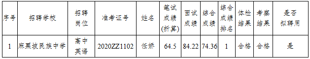 根據(jù)《關(guān)于進(jìn)一步做好面向全國(guó)專(zhuān)項(xiàng)招聘優(yōu)秀高校畢業(yè)生工作的通知》和《文山州教育體育局關(guān)于印發(fā)應(yīng)對(duì)新冠肺炎影響大幅增加名額面向全國(guó)開(kāi)展基礎(chǔ)教育學(xué)校專(zhuān)項(xiàng)補(bǔ)充招聘高校優(yōu)秀畢業(yè)生空缺崗位工作方案的通知》(文教體辦〔2020〕66號(hào))等有關(guān)規(guī)定,麻栗坡縣2020年專(zhuān)項(xiàng)補(bǔ)充招聘經(jīng)過(guò)報(bào)名、筆試、資格復(fù)審、面試、體檢、考察等環(huán)節(jié),現(xiàn)將體檢、考察結(jié)果及擬聘用人員名單公告如下: