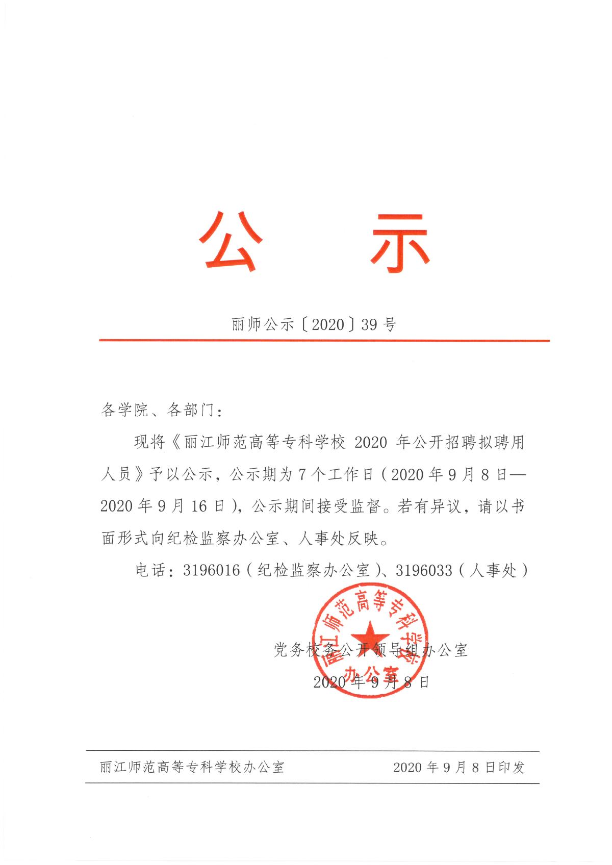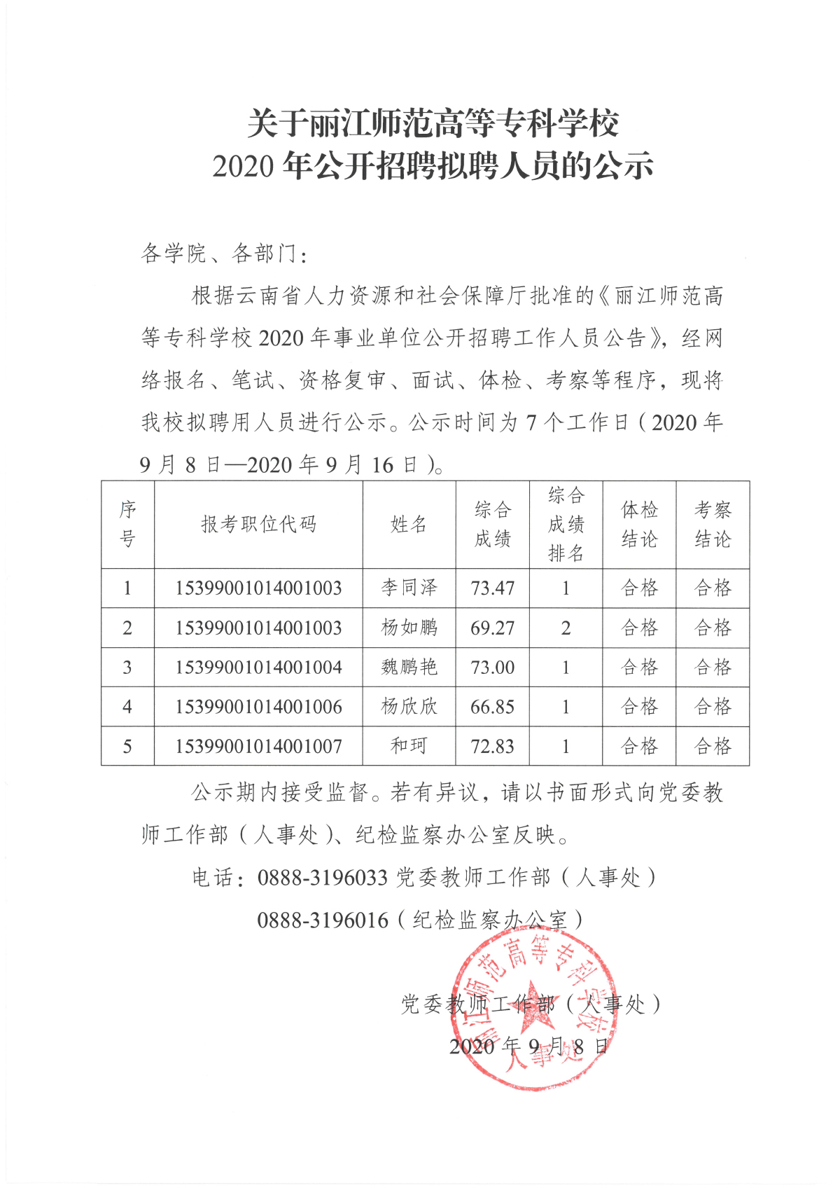 關(guān)于麗江師范高等專科學(xué)校2020年公開招聘擬聘人員的公示