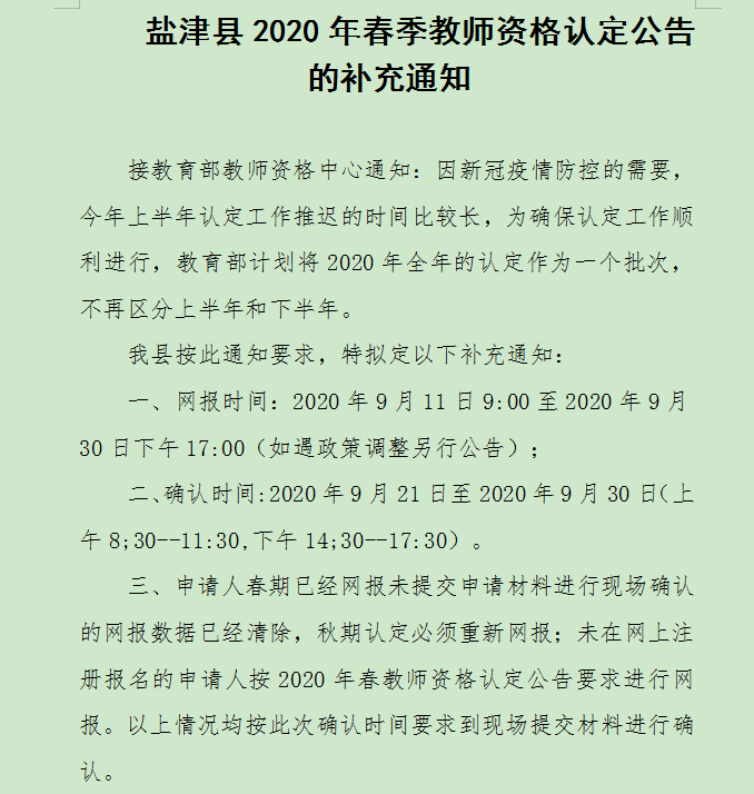 鹽津縣2020年春季教師資格認定公告的補充通知