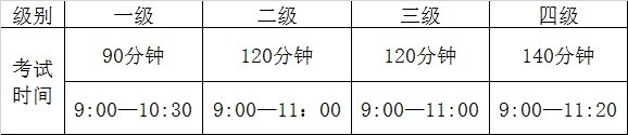 一級B:3分鐘/1名考生;一級:8分鐘/2名考生;二級:10分鐘/2名考生;三級:10分鐘/2名考生;四級:12分鐘/2名考生。